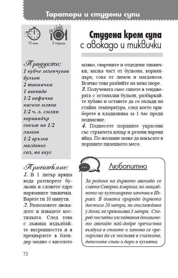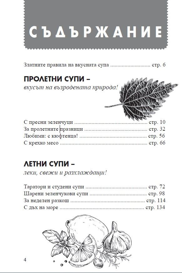 Леки, свежи и разхлаждащи, летните супи представяме в забележителна колекция от рецепти с разнообразни таратори, студени супи, зеленчукови и с дъх на море и по-специални – за неделен разкош.