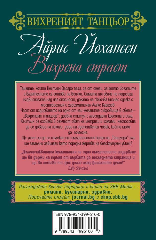 Тайните, които Кейтлин Васаро пази, са от онези, за които богатите и влиятелните са готови на всичко. Самата тя обаче не подозира надвисналата над нея опасност, докато не сключва бизнес сделка с мистериозния и харизматичен Алекс Каразов. Част от издирването на едно от най-желаните съкровища в света – „Вихреният танцьор“, древна статуя с легендарни красота и сила, Кейтлин се озовава в сенчест свят на интриги и измами, неспособна да се довери на никого, дори на единствения човек, който може да помогне.