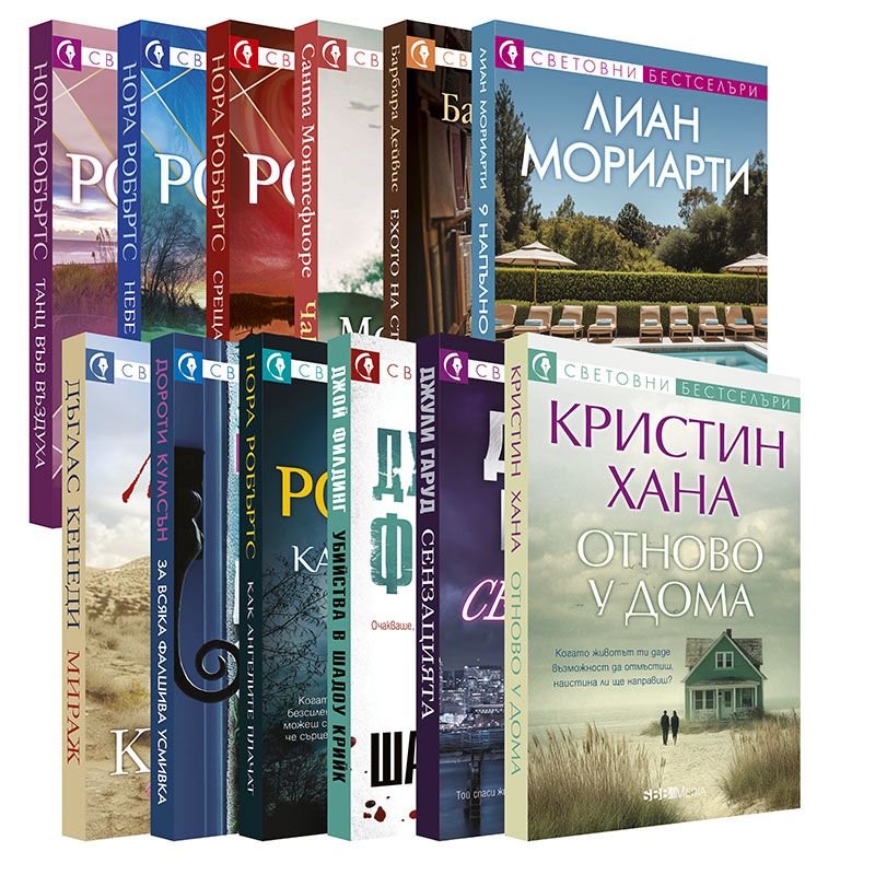 Вземете 12 увлекателни романа само за 72,85 лв./€37,25 с безплатна доставка до офис на Еконт. Колекция „Световни бестселъри“ 2025 на издателство СББ Медиа включва романи на световни автори като Нора Робъртс, Барбара Дейвис, Дороти Кумсън, Уейна Дай Рандъл, Санта Монтефиоре и др.