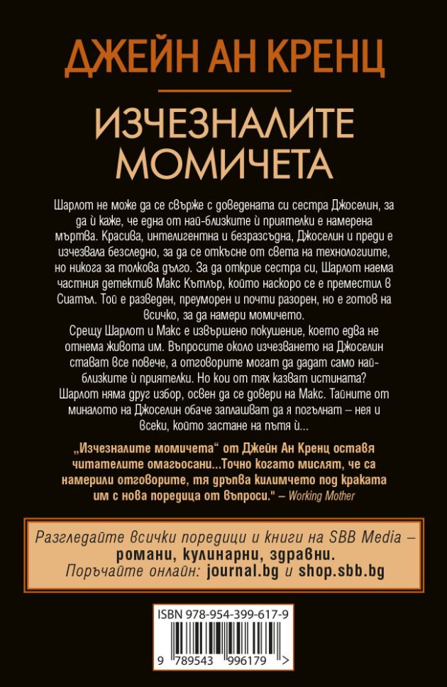 „Изчезналите момичета“ от Джейн Ан Кренц оставя читателите омагьосани...Точно когато мислят, че са намерили отговорите, тя дръпва килимчето под кракатаим с нова поредица от въпроси."
